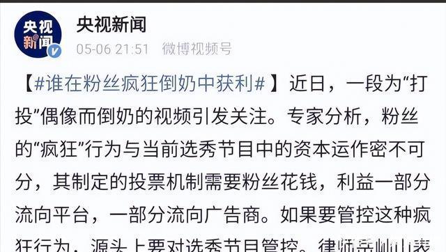 这种消费模式催生了庞大的粉丝经济,娱乐公司、平台、商家都从中获利,但问题也随之出现。 2021年某选秀节目曝出“倒奶事件”,粉丝为了给偶像投票,成箱购买牛奶后只扫瓶盖上的二维码,然后把牛奶倒掉。